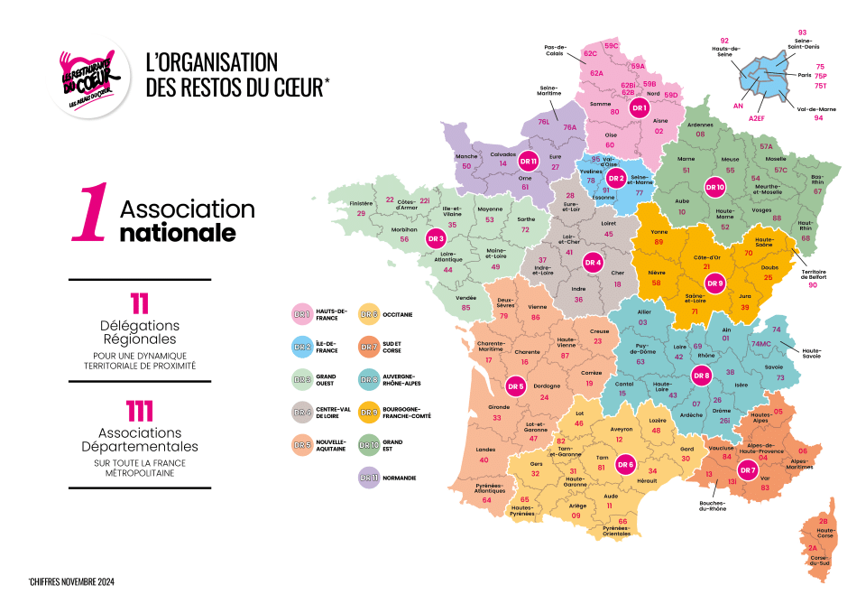 L’Association Nationale des Restos du Cœur compte 11 Délégations régionales en France métropolitaine. Ces Délégations Régionales des Restos du Cœur sont des liens étroits entre le siège national et les associations départementales. Elles participent à la mise en œuvre du projet social et solidaire des Restos du Cœur. Elles ont un rôle clef dans l’animation de la vie associative régionale, impulsant une dynamique collective avec les associations départementales. Leur appartenance à l’Association Nationale et sa proximité avec le terrain en font un acteur clef des Restos sur tout le territoire.