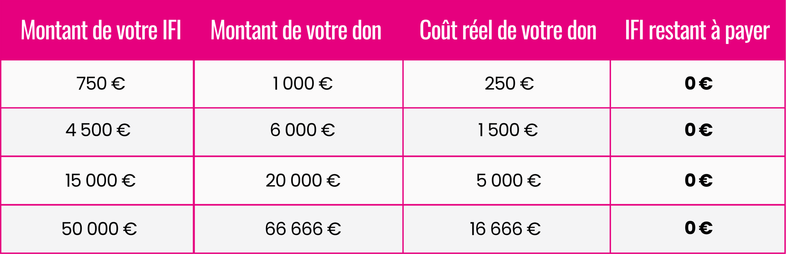 Par exemple : Mon IFI s’élève à 4 500 €, un don de 6 000 € me permet de réduire intégralement mon IFI et ne me revient finalement qu’à 1 500 €.