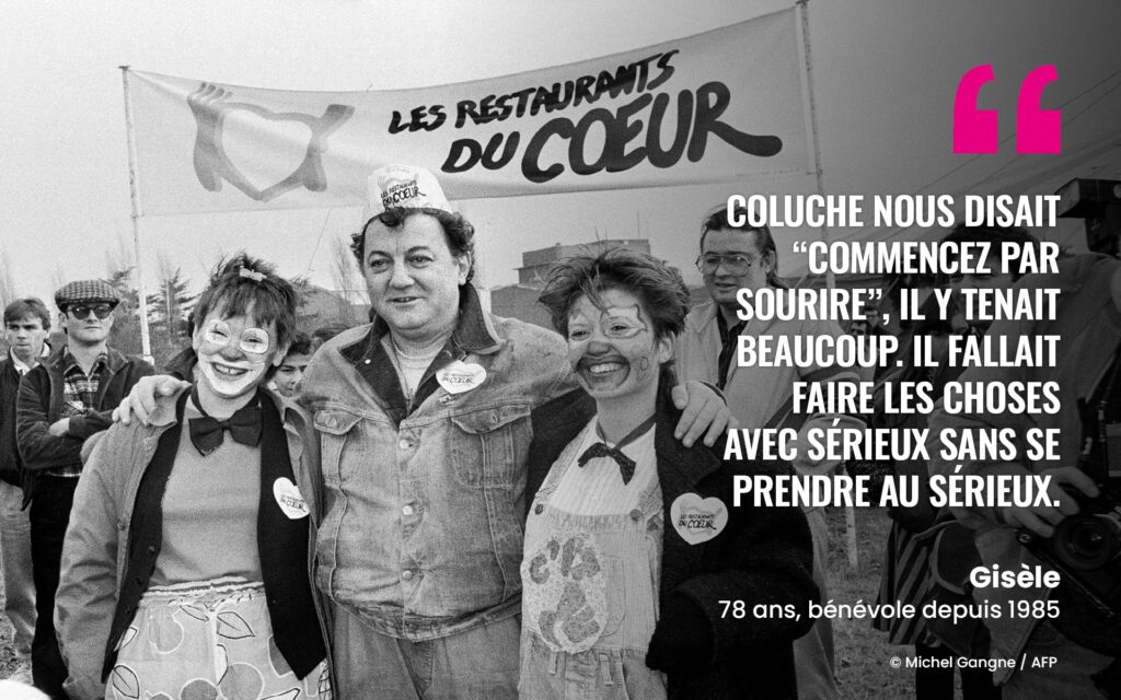 En 1985, Gisèle répondait à l’appel de Coluche : » Il nous disait « commencez par sourire » »