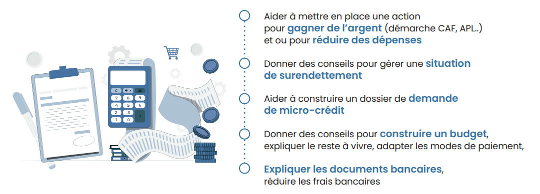 À partir d’un diagnostic partagé de la situation budgétaire du demandeur, l’objectif est de lui faire prendre conscience de ses possibilités financières, de définir un plan d’action pour, à terme, lui permettre d’être autonome pour gérer son budget. Ces conseils sont donnés en complémentarité de l’accompagnement réalisé par le travailleur social, le cas échéant.