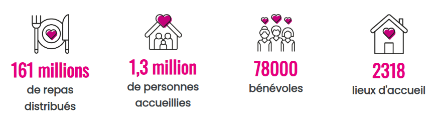 - Aide alimentaire : 161 millions de repas distribués en 2024-2025, grâce à une mobilisation sans relâche de nos bénévoles.